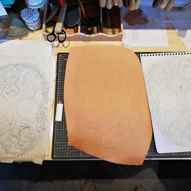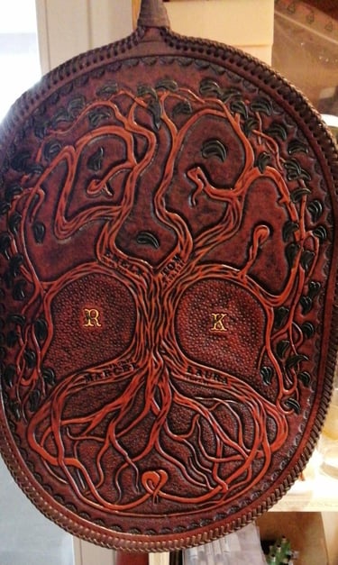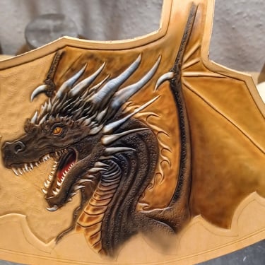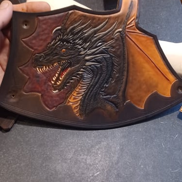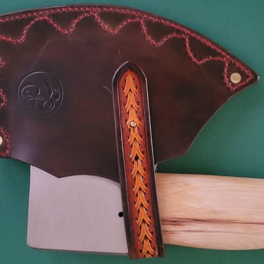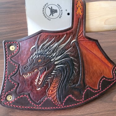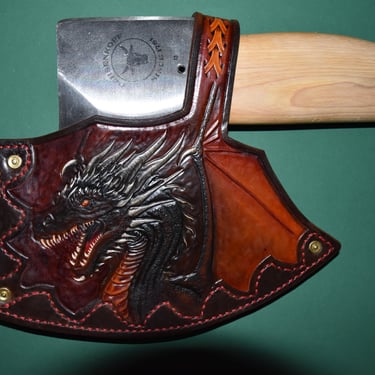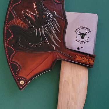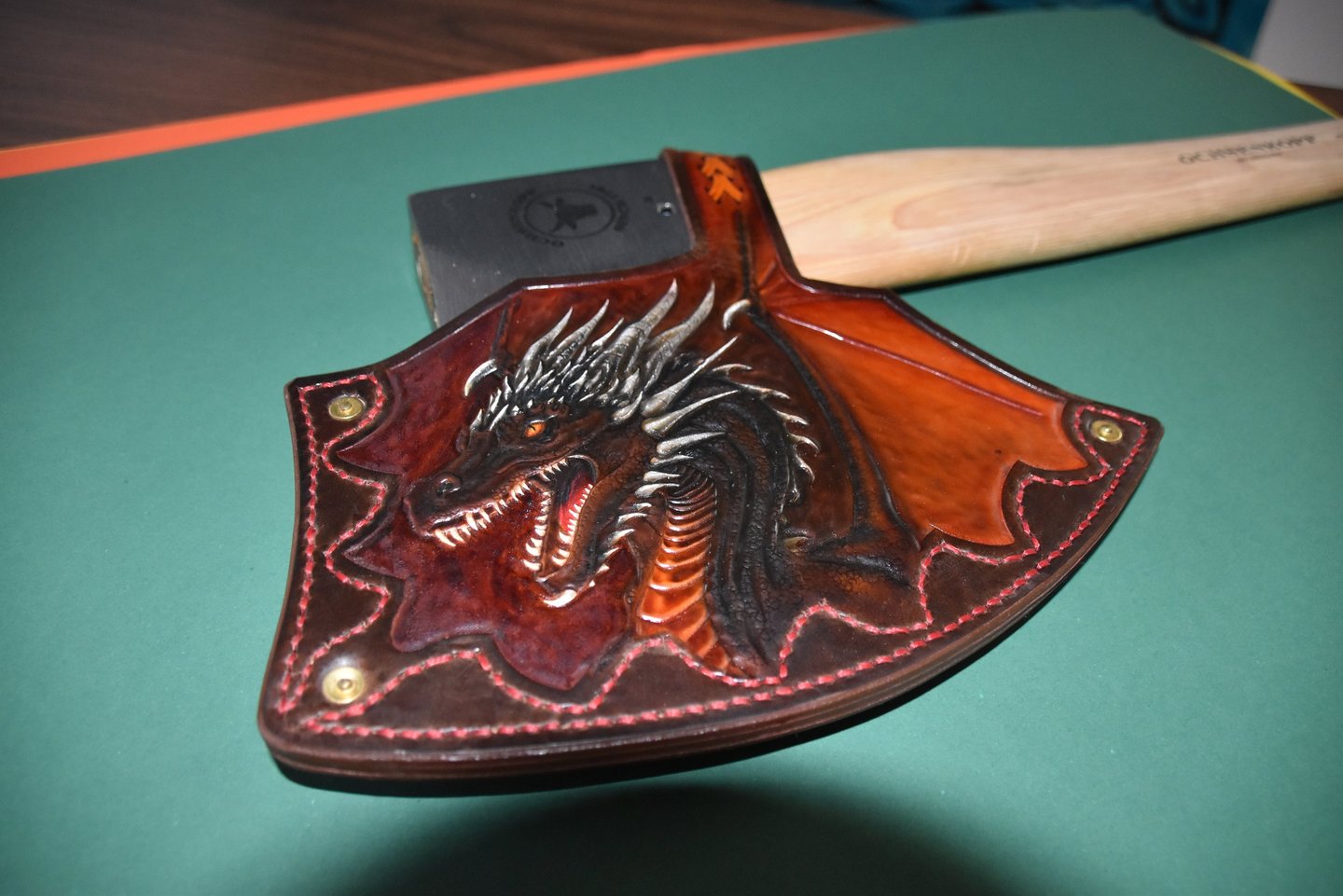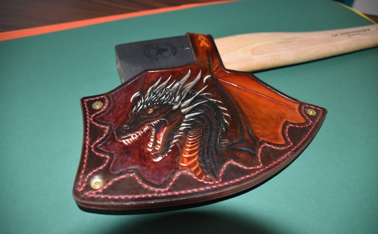 Diese Axtscheide wurde für eine Ochsenkopf Wettkampfaxt entworfen – robust, stilvoll und funktional. Präzise auf die Form der Wettkampfaxt zugeschnitten und auf Kundenwunsch mit einem detailreichen Drachenmotiv versehen, das die Scheide zu einem echten Blickfang macht.