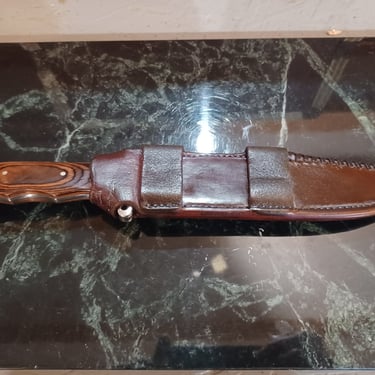 Hier handelt es sich um eine Messerscheide für ein Bowie-Messer. Die Scheide ist vollständig verziert: schlichtere Punzierungen und eine doppelte Loop-Flechtung am Rand verleihen ihr einen edlen, handwerklichen Charakter. Die Scheide wurde nass geformt, sodass das Messer auch bei geöffnetem Riemen zuverlässig am Herausgleiten gehindert wird. Natürlich aus Rindsleder und selbstverständlich auch mit Sattlernaht. Um das Gesammtbild abzurunden bekam die Messerscheide noch eine Polierte Lederkante und wurde Wasserresistent gearbeitet.