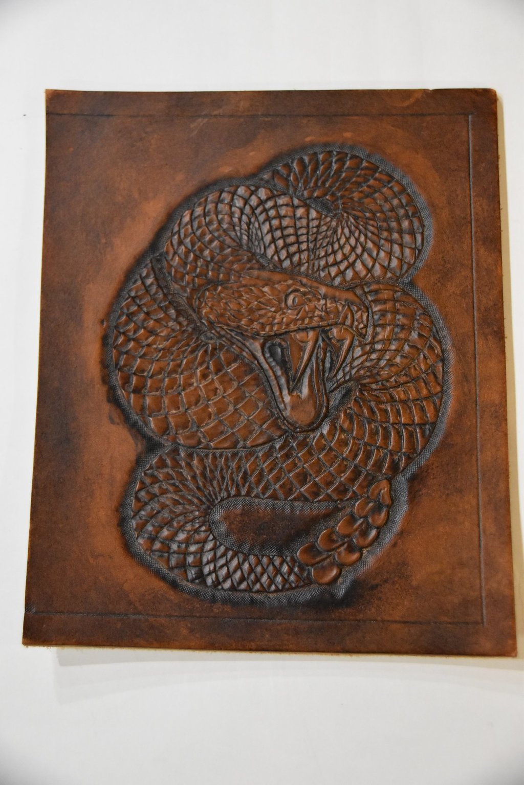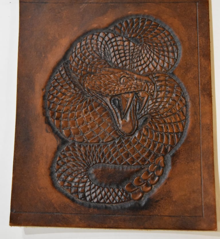 Eine meiner ersten Punzierarbeiten, sieht man stimmts? Das soll gar nicht der Hauptfehler sein, denn der Versteckt sich ganz gut und ist nur für geübte Zeichner auf den ersten Blick sichtbar. Na, wer hat es gefunden? Kleiner Tipp, achtet auf den Schuppenverlauf auf dem Körper der Klapperschlange. Dann solltet ihr recht schnell feststellen, dass die Schuppen mitten im Körper auf einmal die Richtung wechseln was auf keinen Fall natürlich ist und mir selbst erst bei der Ausarbeitung aufgefallen war. Seit damals Zeichne ich meine Vorlagen selbst oder überarbeite zumindest ein wenig vom Kunden gestellte Motive um solche Fehler zu vermeiden.