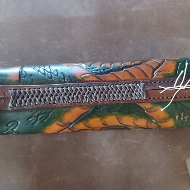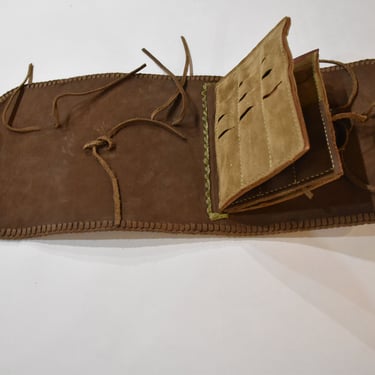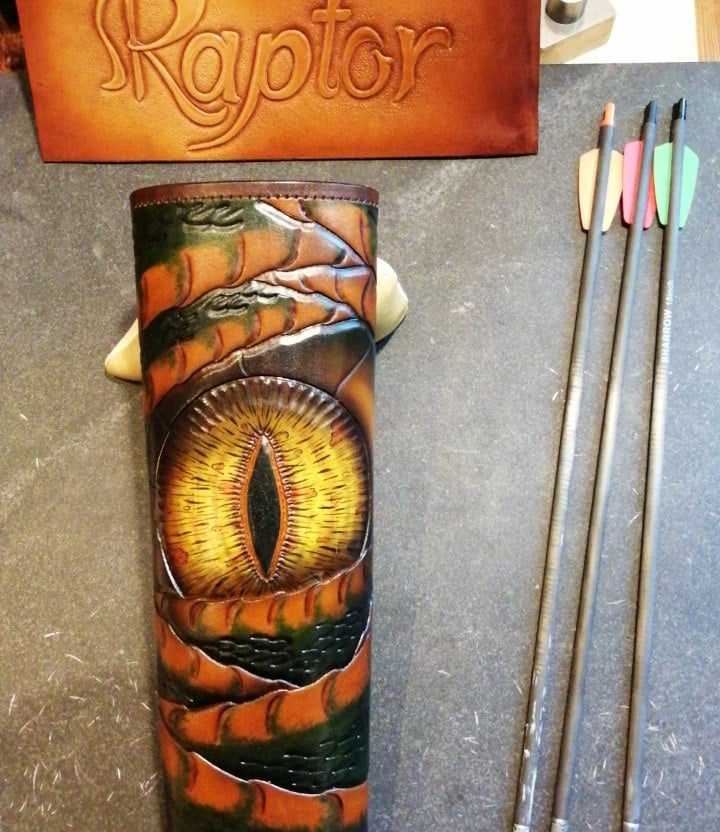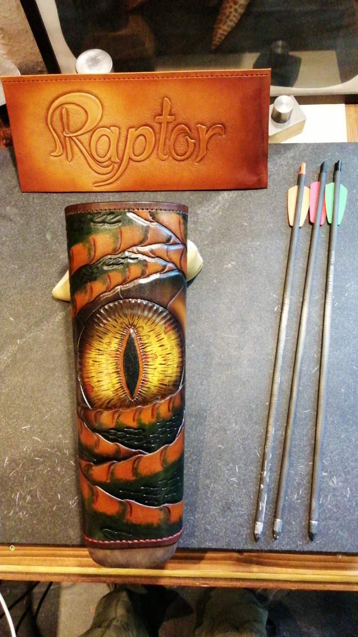 Ein handgefertigter Köcher für Armbrustbolzen, bei dem erstmals Airbrush-Technik zur Lederfärbung eingesetzt wurde. Geplant ist ein abnehmbarer Deckel mit einem eigens entworfenen Schriftzug und alles mit einer "Mexican Braid" Flechtung zu verbinden.