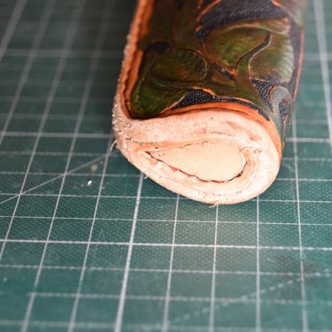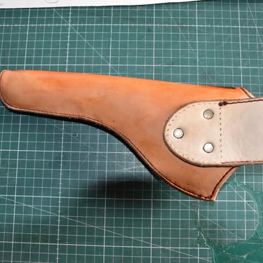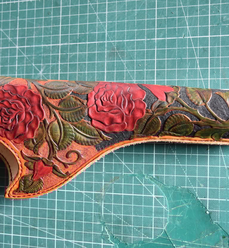 Beim Arbeiten mal kurz mit dem Kopf woanders und schon zu spät, leider recht zu Beginn und somit konnte das Endergebnis nicht wie angedacht fertiggestellt werden. Dafür kann der Holster nichts deswegen noch halbwegs fertiggestellt. Der Holster ist mit einem Futterleder und einer Laufendkappe gefertigt worden. Beim Färben selbst sind sehr viele Details verloren gegangen da ich auf einen Schutz für die Punzierung bewusst verzichtet habe, um dem ganzen ein halbgares Aussehen zu verpassen. Sowie Ausputz und Gürtelschnallennaht hab ich mir gespart da er sowieso auf den Friedhof kommt.