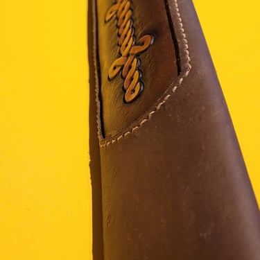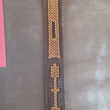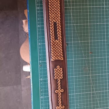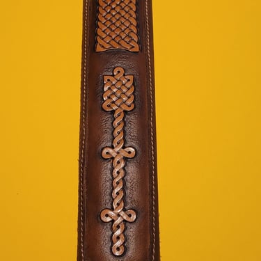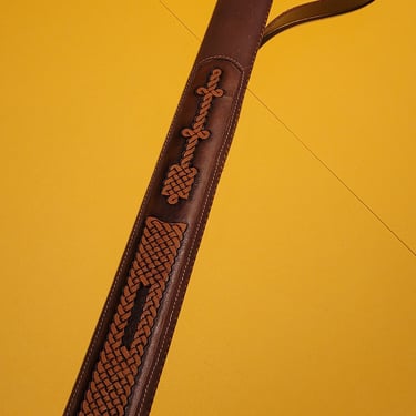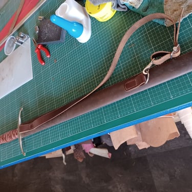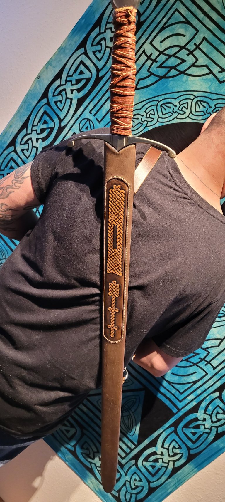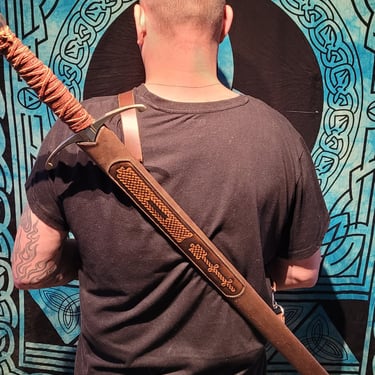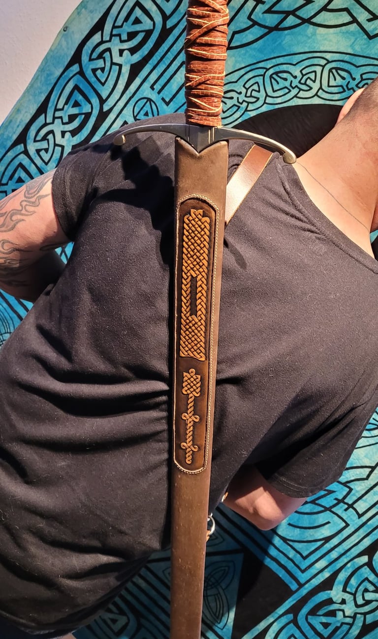 Diese Schwertscheide vereint traditionelle Handwerkskunst mit zeitloser Ästhetik. Ein eingelegtes Leder-Inlay ist mit feinen Punzierungen im Stil keltischer Knoten versehen und verleiht der Scheide eine dezente, aber eindrucksvolle Optik.
