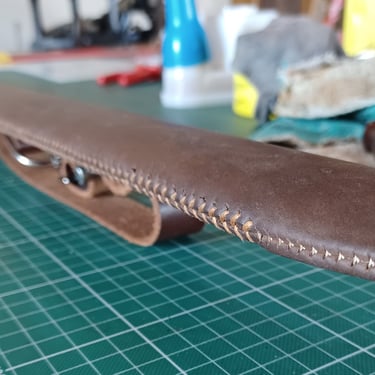 Der Lederbezug wurde im nassen Zustand über einen massiven Holzkorpus gezogen, verklebt und sorgfältig vernäht. Alles in einem Schwung und das bei einer Nahtlänge über 80cm, ein arbeitsintensives Detail, das für Langlebigkeit und perfekte Passform sorgt.