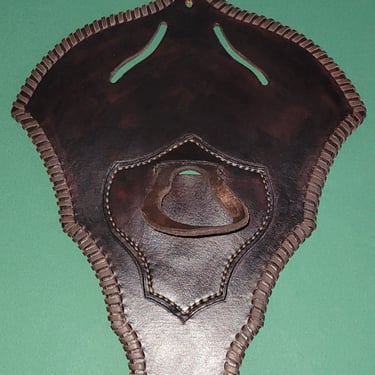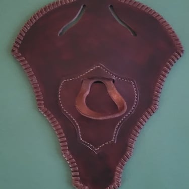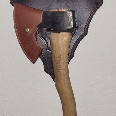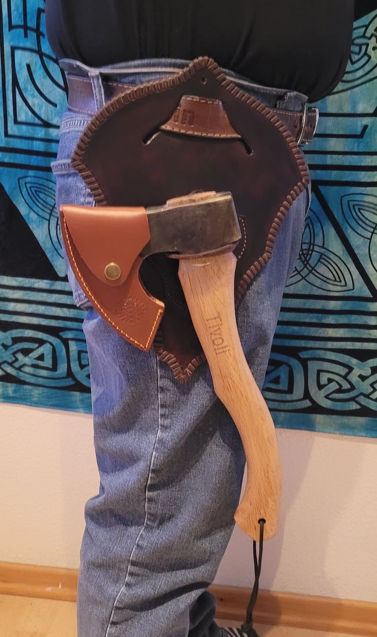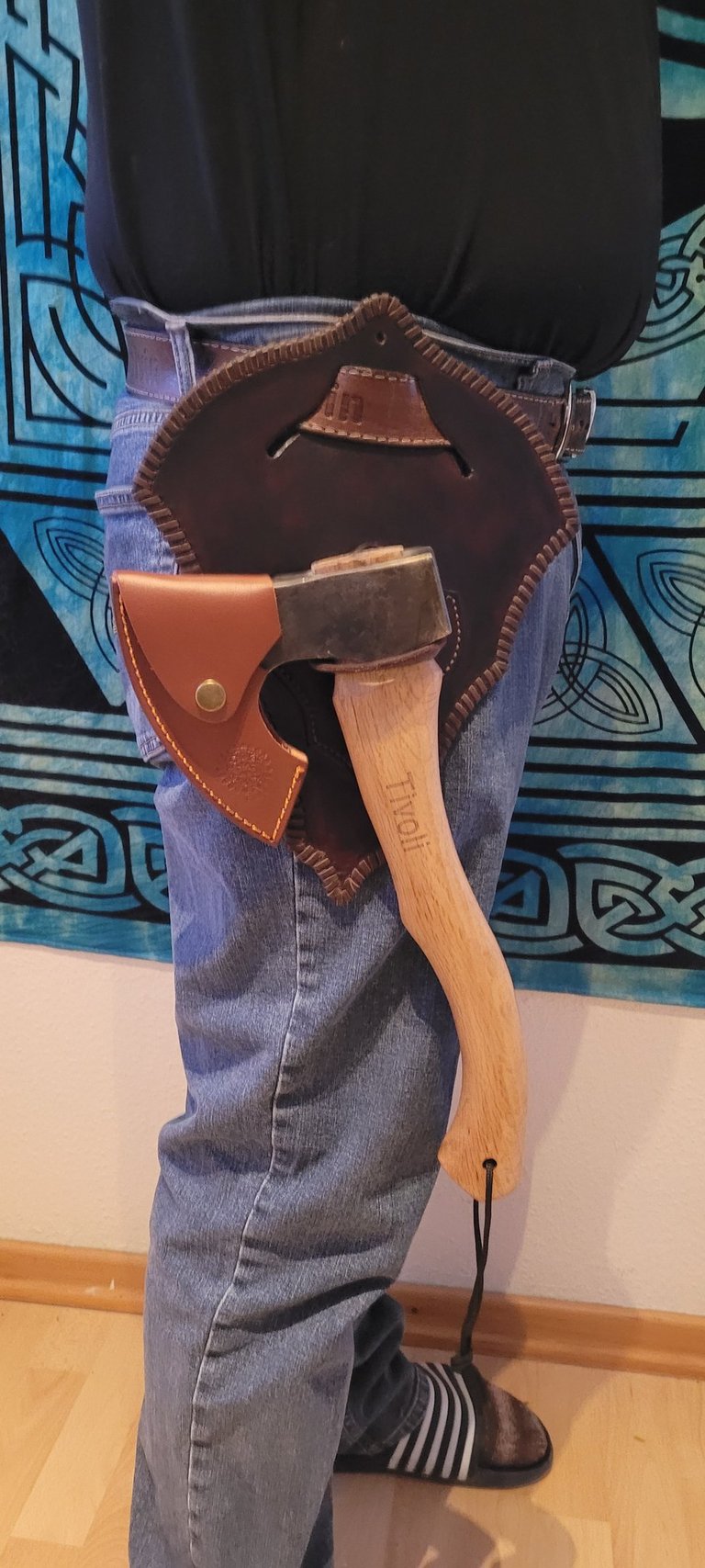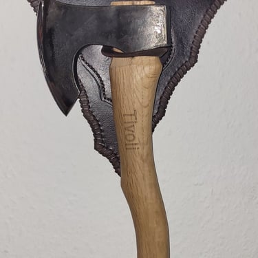 Anforderung war, dass das Beil an die Wand mittels einer Schildartigen Halterung befestigt werden kann. Es wurde auch der Wunsch geäußert, das Beil bei Möglichkeit an den Gürtel zu hängen und somit entstand diese Halterung / Gürtelschlaufen Kombi. Die fleckige Färbung wurde bewusst gewählt, um den rustikalen Look zu unterstreichen.