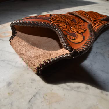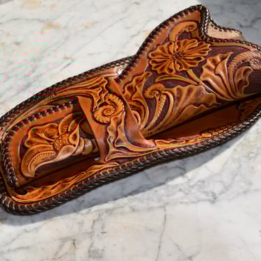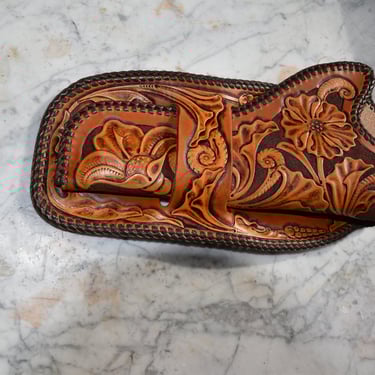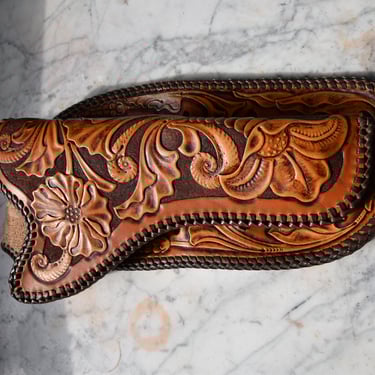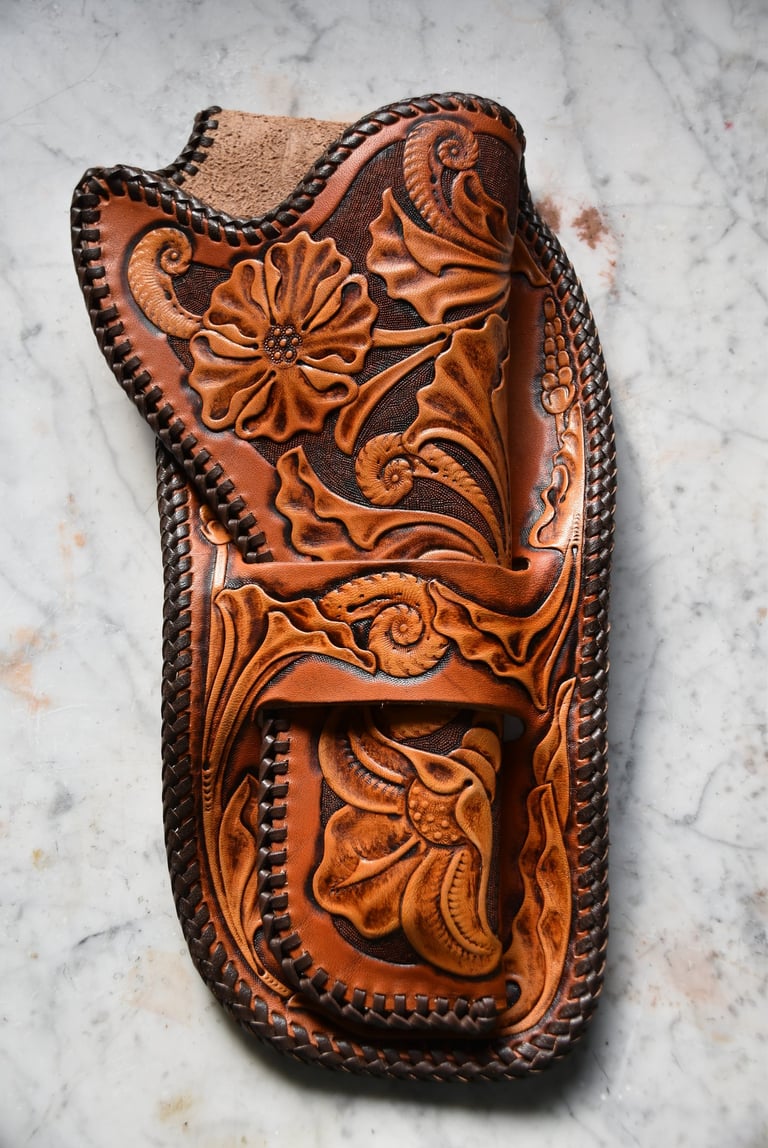 Das Skirt-Holster gehört zu den ältesten Holsterformen des Wilden Westens. Es wird aus einem Stück Leder gefertigt, wobei das Umschlagen des Leders gleichzeitig die Gürtelschlaufe bildet. Dadurch entsteht ein schlichtes, robustes Design mit historischem Flair. Die Klappe und das passende Holsterband lassen sich unterschiedlich ausführen, von schlicht bis verziert. Hier wurde eine Mischung aus verschiedenen floralen Mustern gewählt. Das hier gezeigte Stück wurde zusätzlich mit einer Doppel-Cordovan-Flechtung (Double Loop) versehen, was dem Holster einen eleganteren, handwerklichen Touch verleiht.